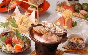 ◆造り ◆郷土寿司 (めはり寿司 さんま寿司 マグロにぎり) ◆天麩羅 ◆マグロの生ハムサラダ ◆黒潮残酷焼 ◆茶碗蒸し ◆鯛の潮汁